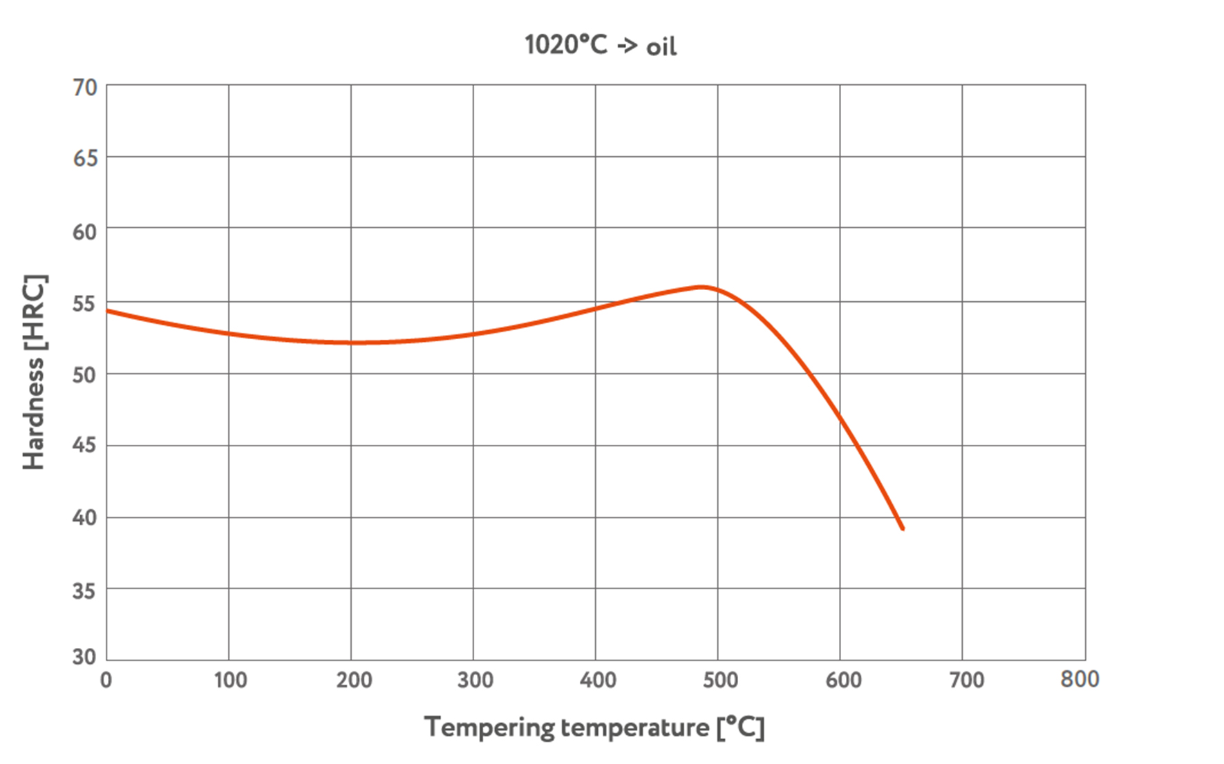 | Hardening | Preheating to 350-400°C Second preheating to 750-850°C Heat to hardening temperature to 1000-1020°C | Min. H.T. for 1 minute /mm | Air or pressure gas by vacuum | Quenched hardness 52-56HRC | |