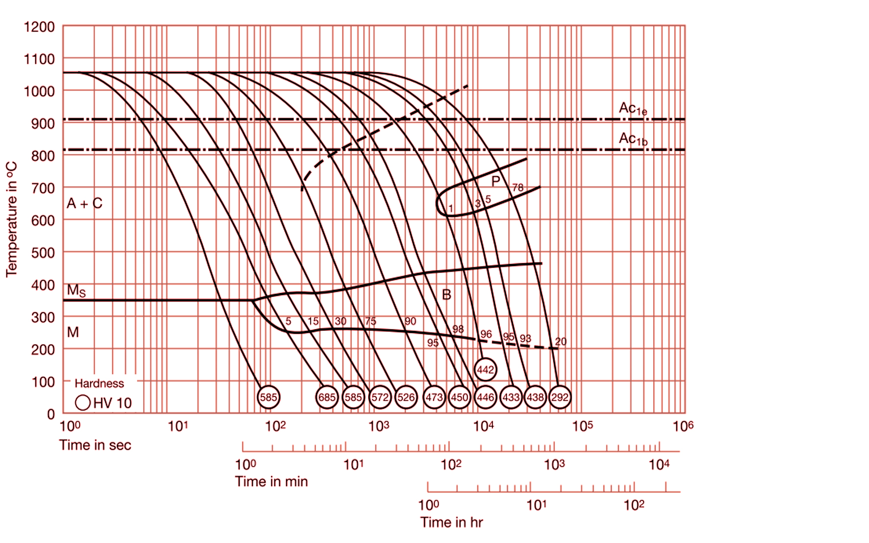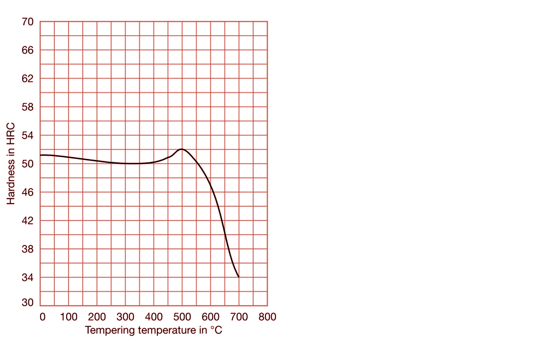 | Hardening | Heat to 1030 – 1050 °C | Min. H.T. for 1 minute /mm | oil or hot bath, 500 – 550 °C | 52 | |
