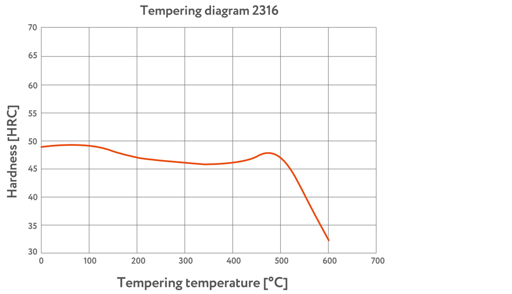 | Tempering | - | - | Air | To be carried out after hardening. 2nd Tempering must be performed to max 30°C below tempering temperature | |