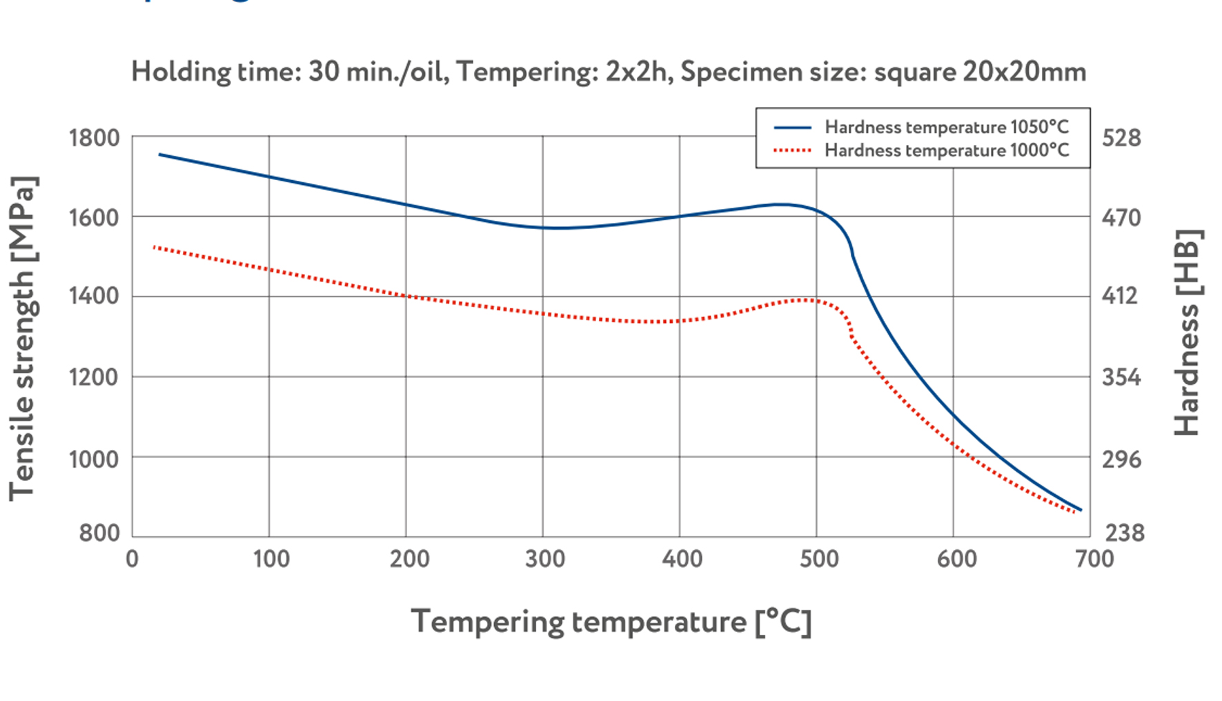| Tempering | Heat to 550 – 610°C | Min. H.T. for 3 minute /mm | Air of furnace | To be carried out after hardening. 2nd Tempering must be performed to max 30°C below tempering temperature | |