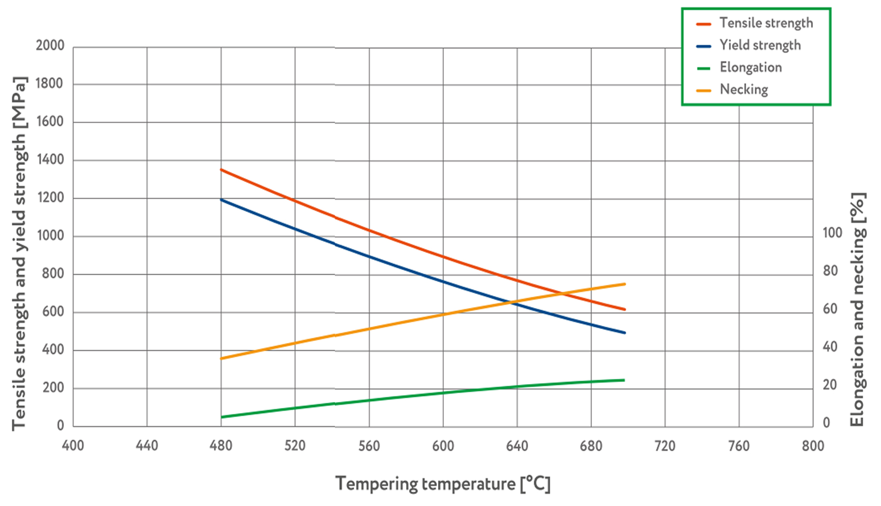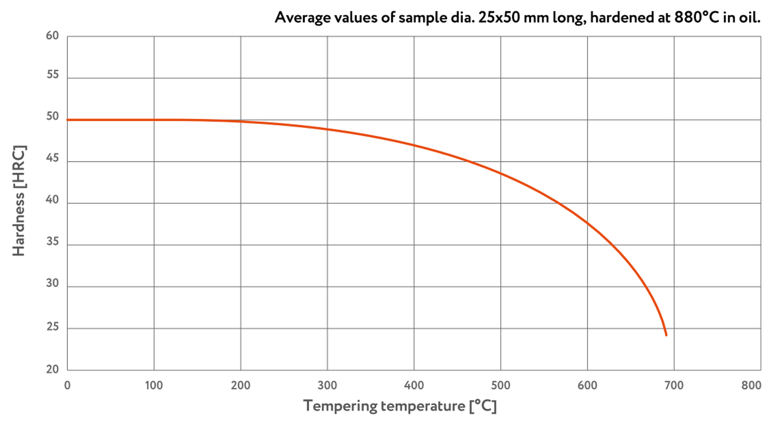 | Tempering | In the range 530 – 610°C | Min. H.T. for 3 minute /mm | Air or furnace | To be carried out after hardening. 2nd Tempering must be performed to max 30°C below tempering temperature | |