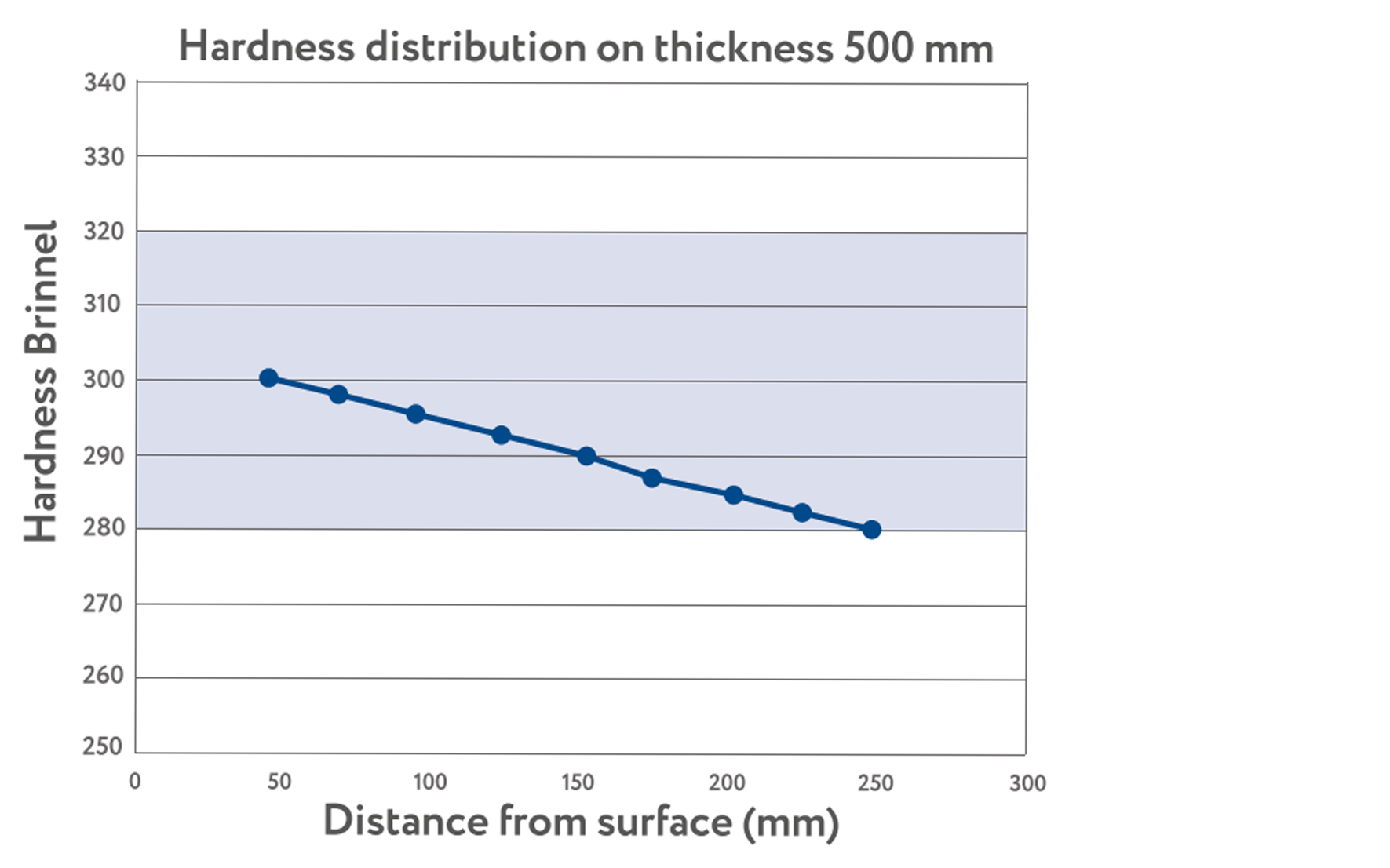 The high performance of hardenability for thickness 600 mm, is obtained by an optimized balance of chemical composition and a special manufacturing process.